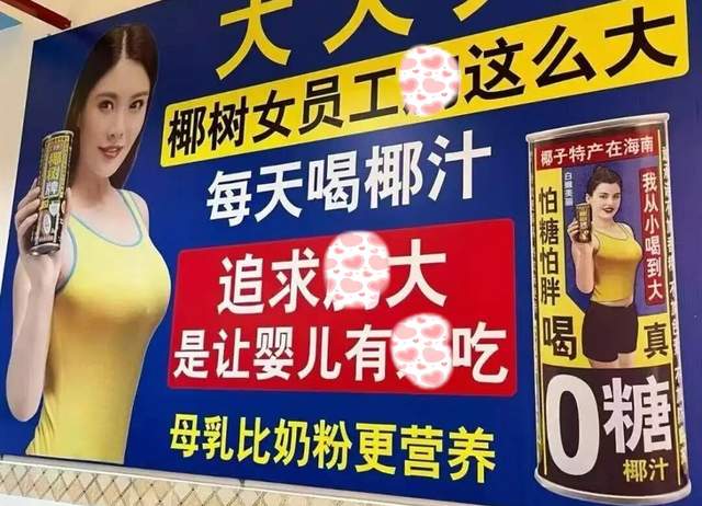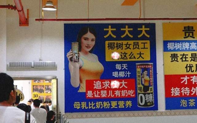 近日,海椰树海南椰树集团对外开放工厂参观。其中,多位参观者反映,椰树工厂悬挂的广告涉嫌低俗营销。图片显示,粘贴的广告写有“椰树女员工xiong这么大”“追求xiong大是让婴儿有奶吃”等标语,引发热议。