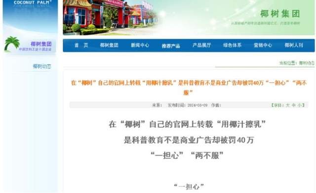 具体表现为 :不服在“椰树”自己的官网上转载“用椰汁擦乳”“南太平洋美女很少‘飞机场’”是科普教育,不是商业广告。广告法没有哪一条明确规定在自己的官网上转载科普教育是违法的,“法无禁止即可为”。