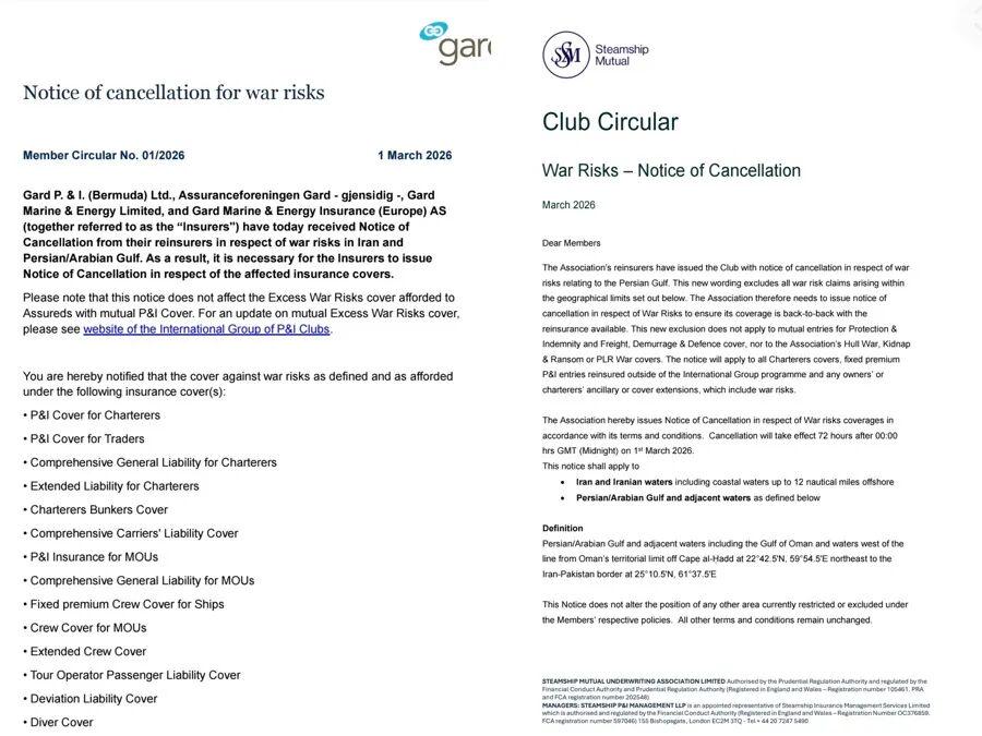 如国际保赔机构Gard AS(嘉德保险)于3月1日发布公告称,“今日收到再保险公司就伊朗和波斯湾/阿拉伯湾战争风险发出的取消通知。因此,保险公司必须就受影响的保险单发出取消通知。”Assuranceforeningen Skuld(斯库德保赔协会)、Steamship Mutual(轮船互助保赔协会)等也先后发布相关取消通知。