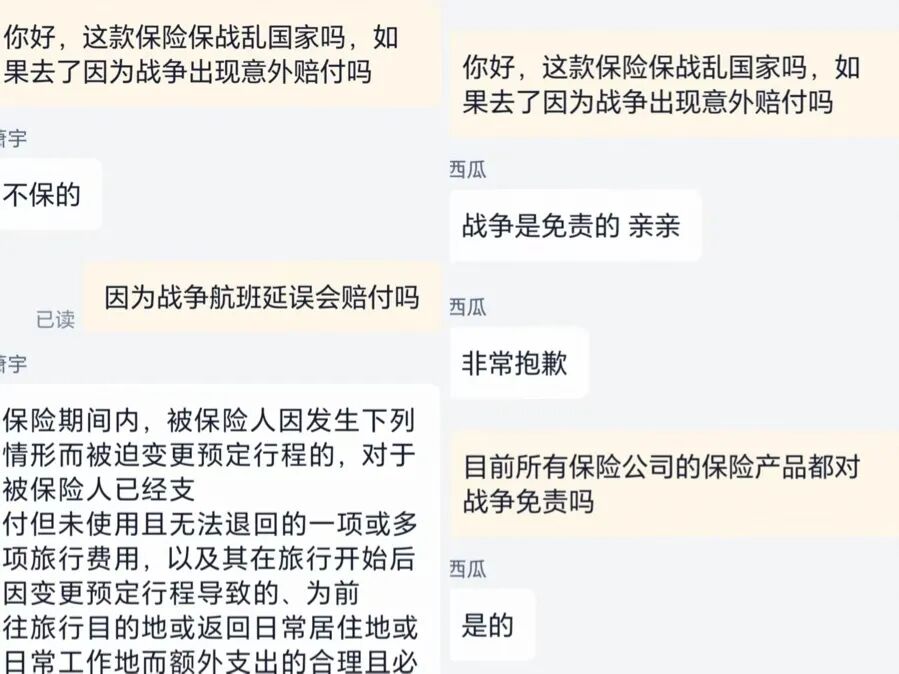 例如,近日记者咨询多家保险机构的境外旅游险、财产险等常规保险产品,其均表示将战争、军事行动、暴乱、核辐射等高风险因素排除在保障范围之外。但记者也注意到,部分具备海外急难救援服务网络的保险机构,也正为中国公民提供相关协助。