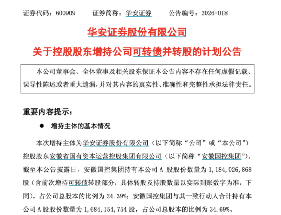 3月1日晚间,华安证券披露,安徽国控集团拟于3月2日至3月6日(五个交易日内)投入1.5亿元至3亿元,以“购买可转债并转股”的方式增持华安证券股份。