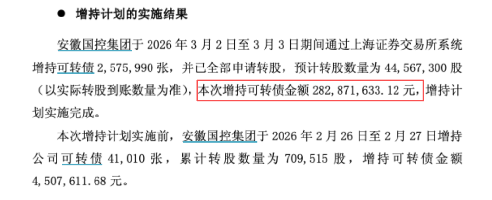 根据华安证券最新披露的公告,安徽国控集团于3月2日至3月3日期间增持可转债2575990张,并已全部申请转股,预计转股数量为44567300股,增持金额约2.83亿元。这意味着,此次增持计划的上限3亿元已基本用满。