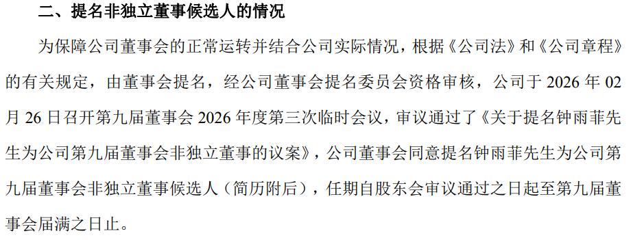众泰汽车近期发布公告,公司非独立董事林隆华因个人工作规划辞职,董事会同意提名钟雨菲为第九届董事会非独立董事候选人,任职资格尚待股东大会审议通过。