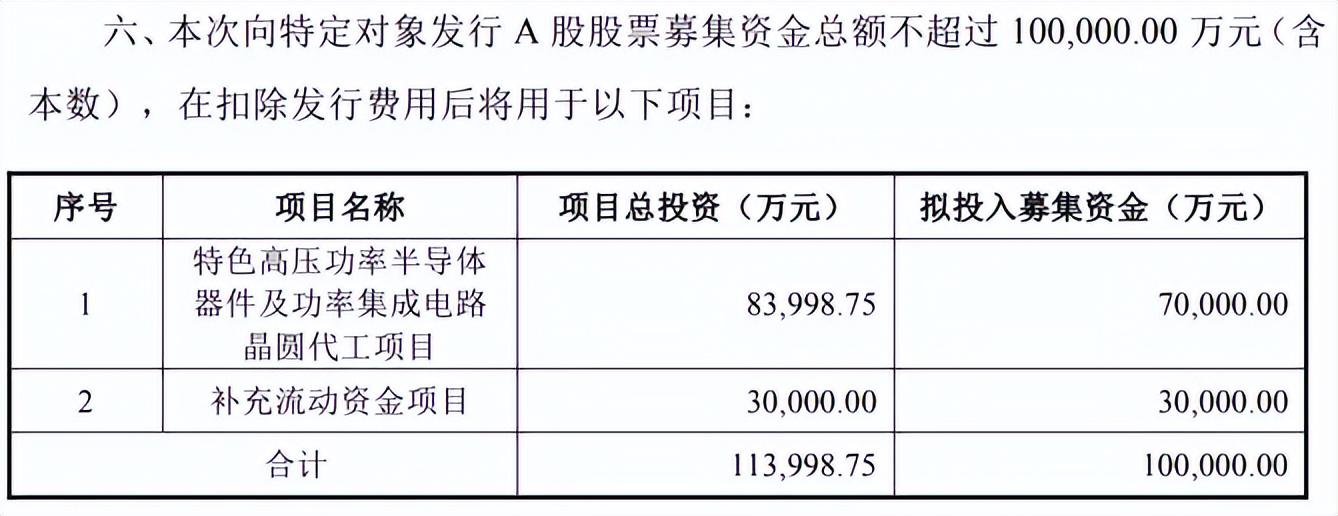 本次10亿元定增,资金去向十分集中:7亿元投向特色高压功率半导体器件及功率集成电路晶圆代工项目,3亿元用于补充流动资金。