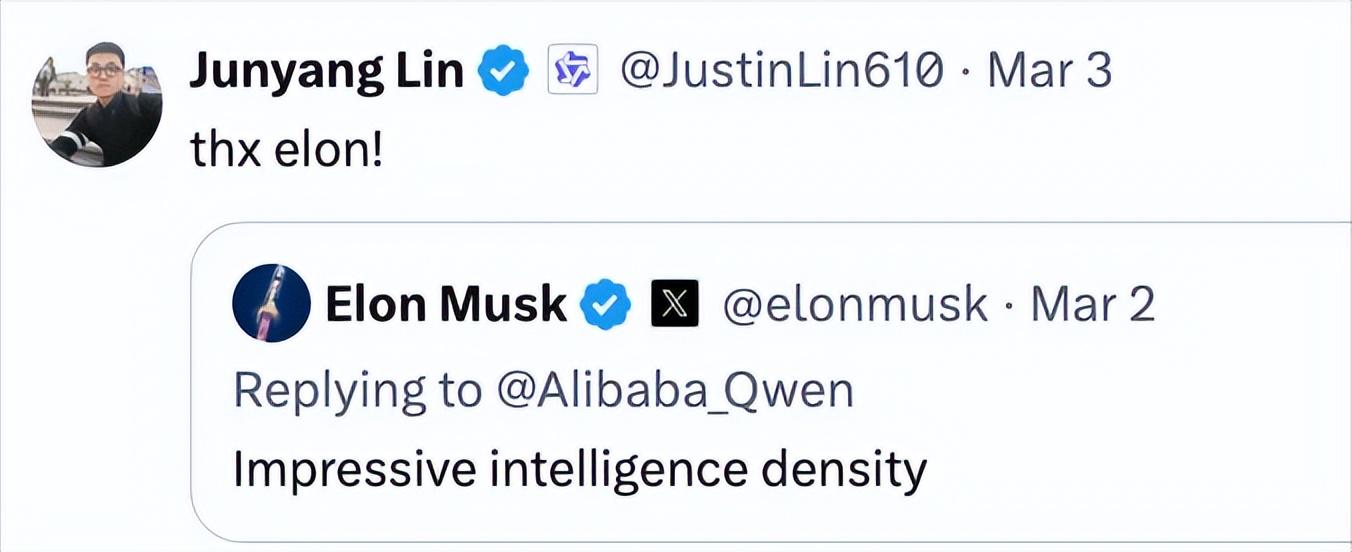 对此,马斯克称其有着“令人惊叹的智能密度”,林俊旸转发并向马斯克致谢。一切看似风平浪静。