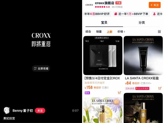 美妆博主“Benny董子初”(以下简称:董子初)近日在社交平台宣布,“CROXX即将重启”。在CROXX的天猫旗舰店中,也可以发现,以“CROXX”为品牌名的面膜、洗面奶等产品上新,并正在开启预售。