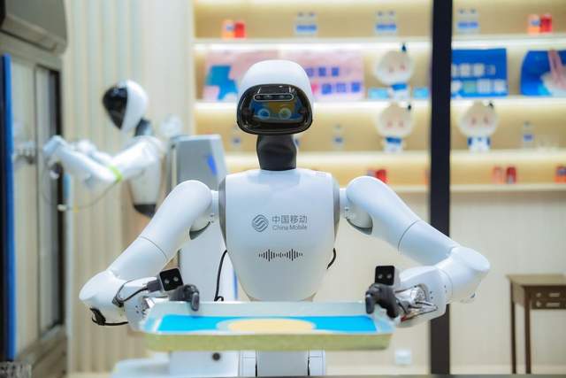 中国移动展区,人形机器人随音乐起舞,动作整齐划一。它们不只是气氛组:迎宾接待、讲解导览、智慧运营,一个人能包揽一场小型晚会的活。