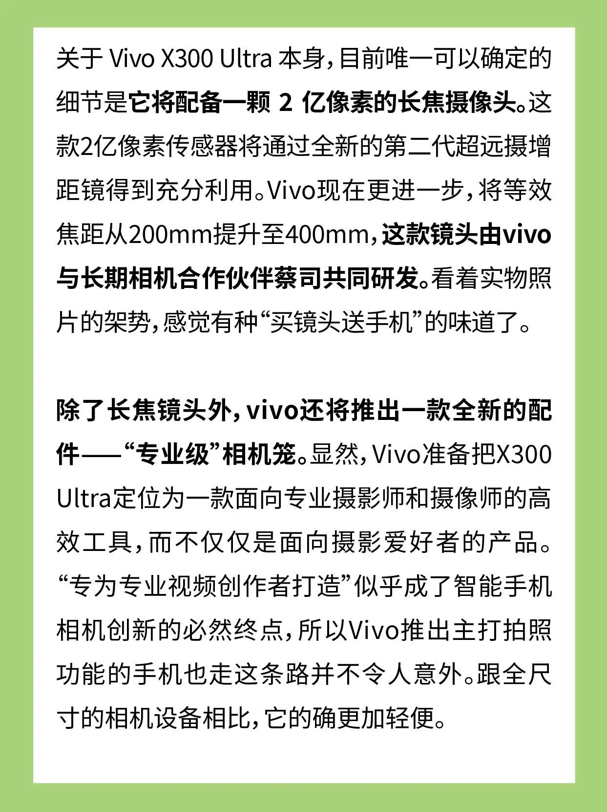Vivo 很少参加 MWC,但今年却打破了这一惯例,发布了其下一代旗舰手机 X300 Ultra,同时还推出了升级版长焦镜头(等效焦距达到400mm)和专业相机笼。“专为专业视频创作者打造”似乎成了智能手机相机创新的必然终点,所以Vivo推出主打拍照功能的手机也走这条路并不令人意外。跟全尺寸的相机设备相比,它的确更加轻便。