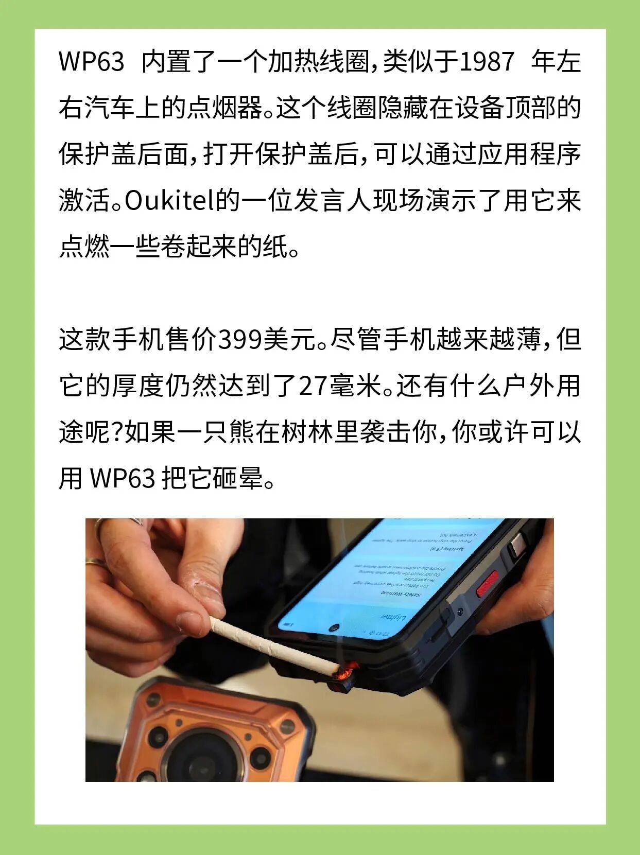 这款手机售价399美元。尽管手机越来越薄,但它的厚度仍然达到了27毫米。还有什么户外用途呢?如果一只熊在树林里袭击你,你或许可以用 WP63 把它砸晕。