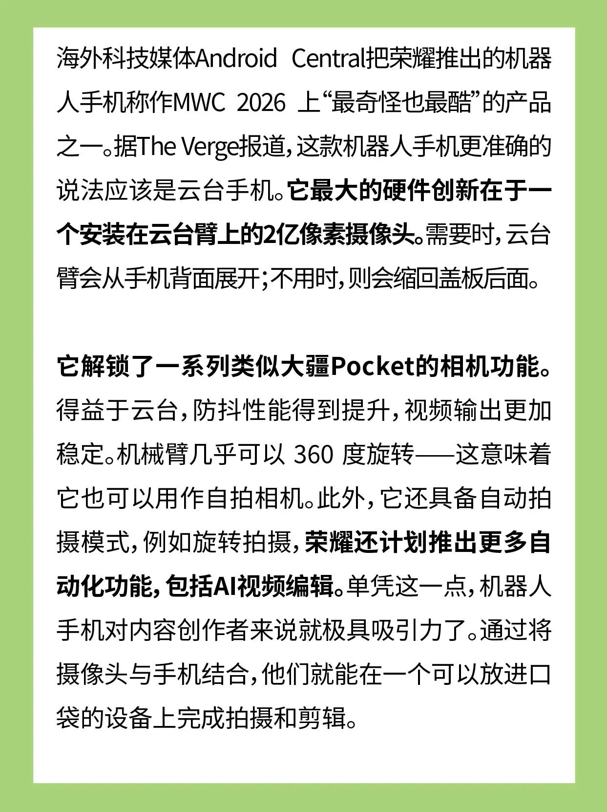 海外科技媒体Android Central 把荣耀推出的机器人手机称作 MWC 2026 上“最奇怪也最酷”的产品之一。据The Verge 报道,这款机器人手机更准确的说法应该是云台手机。它最大的硬件创新在于一个安装在云台臂上的2亿像素摄像头。需要时,云台臂会从手机背面展开;不用时,则会缩回盖板后面。