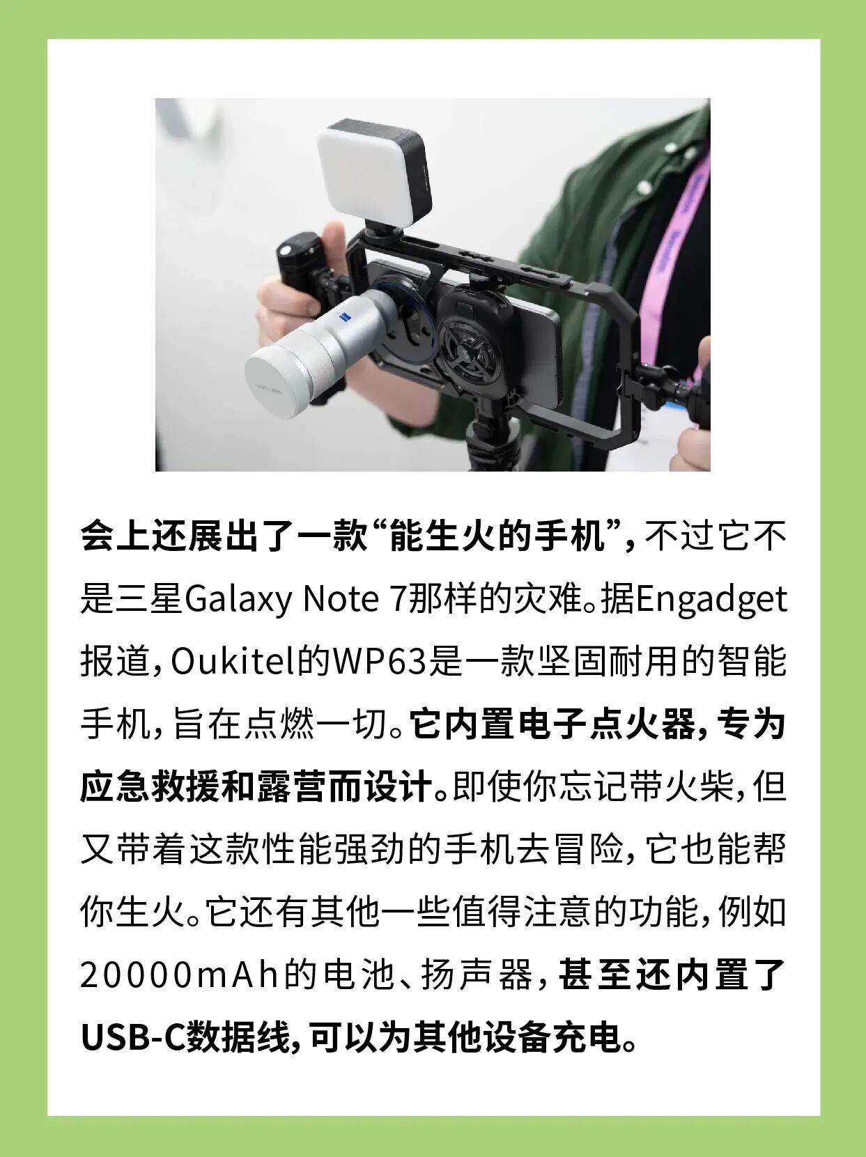 会上还展出了一款“能生火的手机”。据Engadget报道,Oukitel的WP63是一款坚固耐用的智能手机,旨在点燃一切。它内置电子点火器,专为应急救援和露营而设计。即使你忘记带火柴,但又带着这款性能强劲的手机去冒险,它也能帮你生火。它还有其他一些值得注意的功能,例如20000mAh的电池、扬声器,甚至还内置了USB-C数据线,可以为其他设备充电。