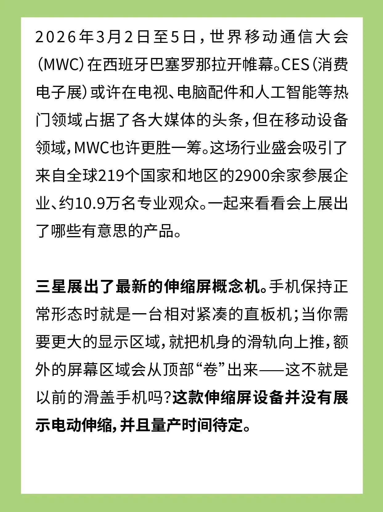 2026年3月2日至5日,世界移动通信大会(MWC)在西班牙巴塞罗那拉开帷幕。CES(消费电子展)或许在电视、电脑配件和人工智能等热门领域占据了各大媒体的头条,但在移动设备领域,MWC也许更胜一筹。这场行业盛会吸引了来自全球219个国家和地区的2900余家参展企业、约10.9万名专业观众。