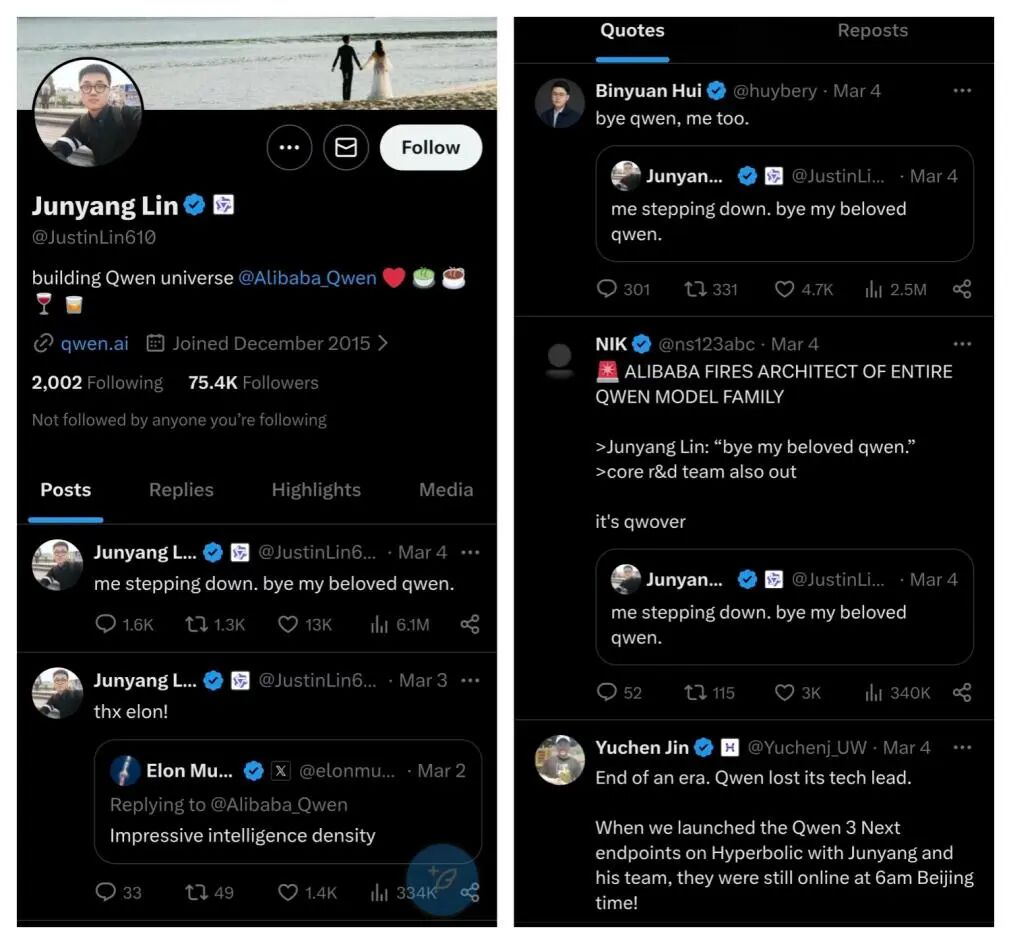 前一日,林俊暘在社交平台上宣布离职,“me stepping down. bye my beloved qwen.”(我卸任了,再见,我亲爱的千问)。