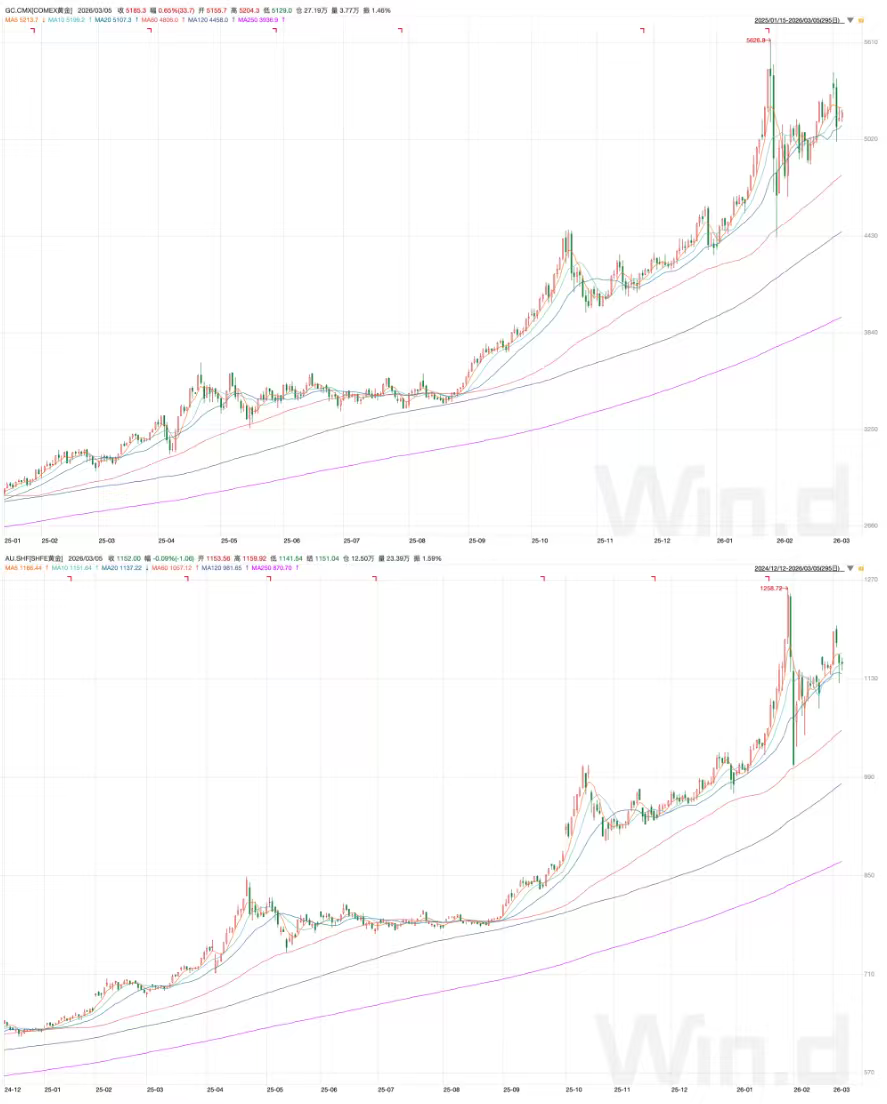 再看作为传统避险资产的黄金,却未如市场预期般在中东战时进展的同时一飞冲天,而是陷入了宽幅震荡中。分品种来看,COMEX黄金期货价格一度站上5400美元/盎司的阶段性高位,但很快又出现了调整,沪金期货的走势与COMEX金类似。