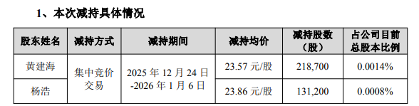 截至2026年1月6日,黄建海、杨浩减持计划已完成。黄建海减持21.87万股,减持均价23.57元/股;杨浩减持13.12万股,减持均价23.86元/股。以此计算,两人合计套现约828.5万元。