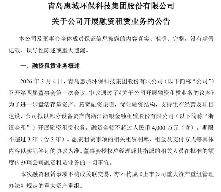 2026 年 3 月 4 日,青岛惠城环保科技集团股份有限公司(股票代码:300779)发布公告,公司第四届董事会第三次会议审议通过《关于公司开展融资租赁业务的议案》,拟以部分设备资产为标的,与浙江浙银金融租赁股份有限公司开展融资租赁合作,融资金额不超过 4000 万元,租赁期限不超过 3 年。本次交易旨在盘活存量资产、拓宽融资渠道、优化债务结构,为公司生产经营与重点项目建设提供资金支持。
