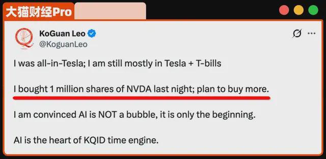 这两天,华裔大佬廖凯原(KoGuan Leo)官宣,他买了100万股英伟达。