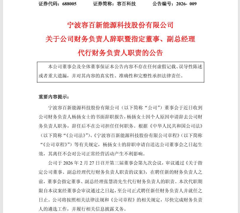 2026年2月28日,容百科技披露人事变动公告,公司董事会近日收到财务负责人杨扬女士的书面辞职报告。