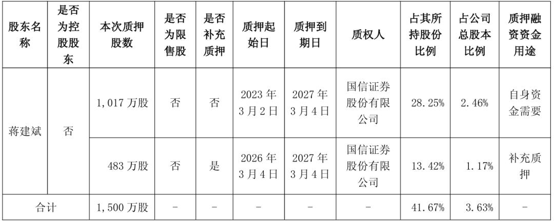 截至目前,蒋建斌累计质押股份 1500 万股,占其持股总数的 41.67%,占公司总股本的 3.63%。公告同时提示,本次质押股份未被用作重大资产重组业绩补偿等事项的担保,蒋建斌的一致行动人亦不存在股份质押情形。