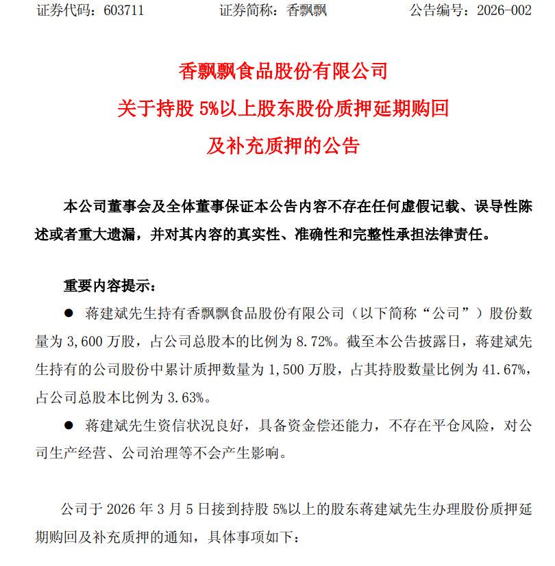 3 月 5 日,香飘飘(603711)发布公告,公司持股 5% 以上股东蒋建斌对其所持股份进行延期购回及补充质押,在公司业绩持续承压、股价长期低迷的背景下,这一操作再度引发市场对其经营与资本状况的关注。