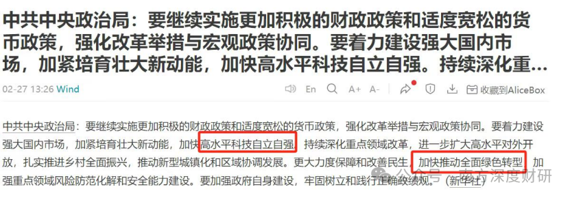 继前两天的政治局会议将加快推动全面绿色转型作为与科技自立自强同等的主题,今天发布的政府工作报告更是将“未来能源”首次被写入政府工作报告。