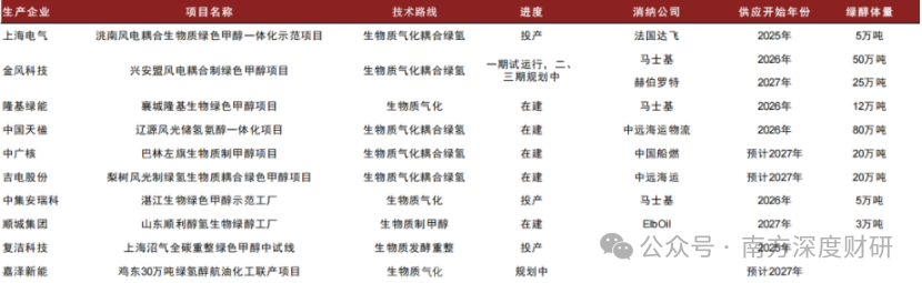 从已披露项目来看,中国天楹辽源风光储氢氨醇一体化项目绿醇体量达80万吨,金风科技兴安盟项目达50万吨,均远超其他企业;且二者均预计2026年开始供应,是产能体量和进度双双靠前的龙头,将率先受益于绿色甲醇需求爆发;
