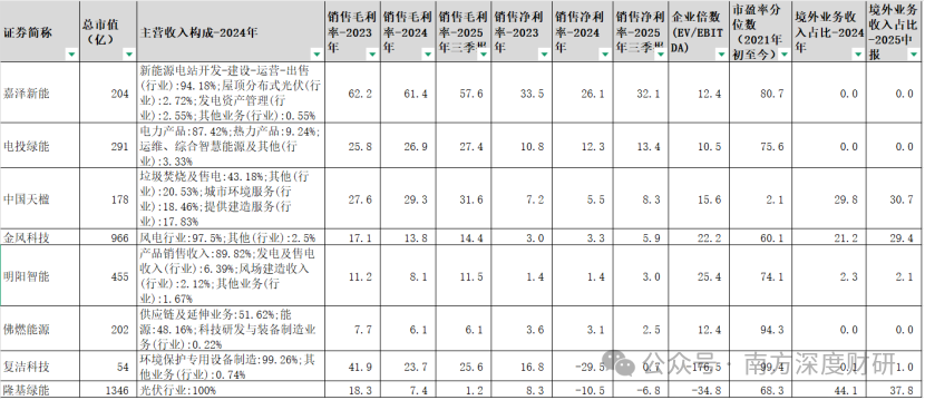 就相对估值角度,电投绿能、佛燃能源、嘉泽新能、中国天楹的企业倍数(EV/EBITDA)相对较低,就同时期市盈率分位数而言,相对较低的是中国天楹、金风科技;