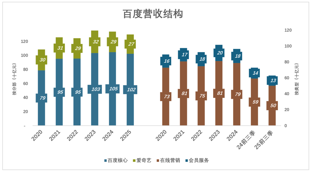 2025年,百度核心营收1024亿、同比下降2.2%;爱奇艺营收273亿、同比下降6.6%(不考虑分部间抵消)。