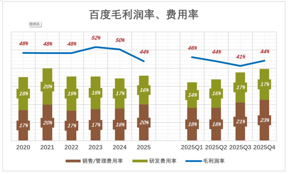 2024年,百度集团毛利润率50.3%,销售/管理费用率17.7%,研发费用率16.6%; 2025年,百度集团毛利润率降至43.9%,销售/管理费用率提高到20%,研发费用率降至15.8%;