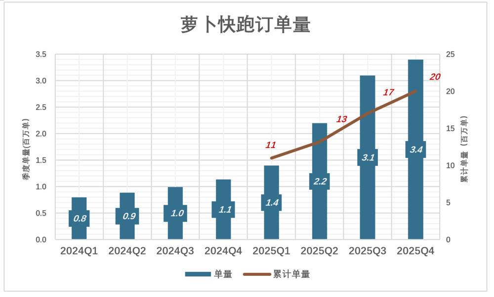 2025年Q1,全无人驾驶(车内没有安全员)单量310万单、累计1100万单; 2025年Q2,全无人驾驶单量220万单,累计1300万单; 2025年Q3,全无人驾驶单量310万单,累计1700万单; 2025年Q4,全无人驾驶单量340万单,累计2000万单;