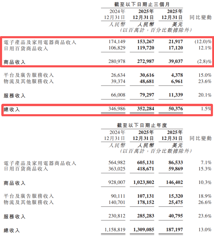 所以尽管四季度囊括了双十一大促这个关键节点,但京东的商品收入,还是直接进入了负增长。