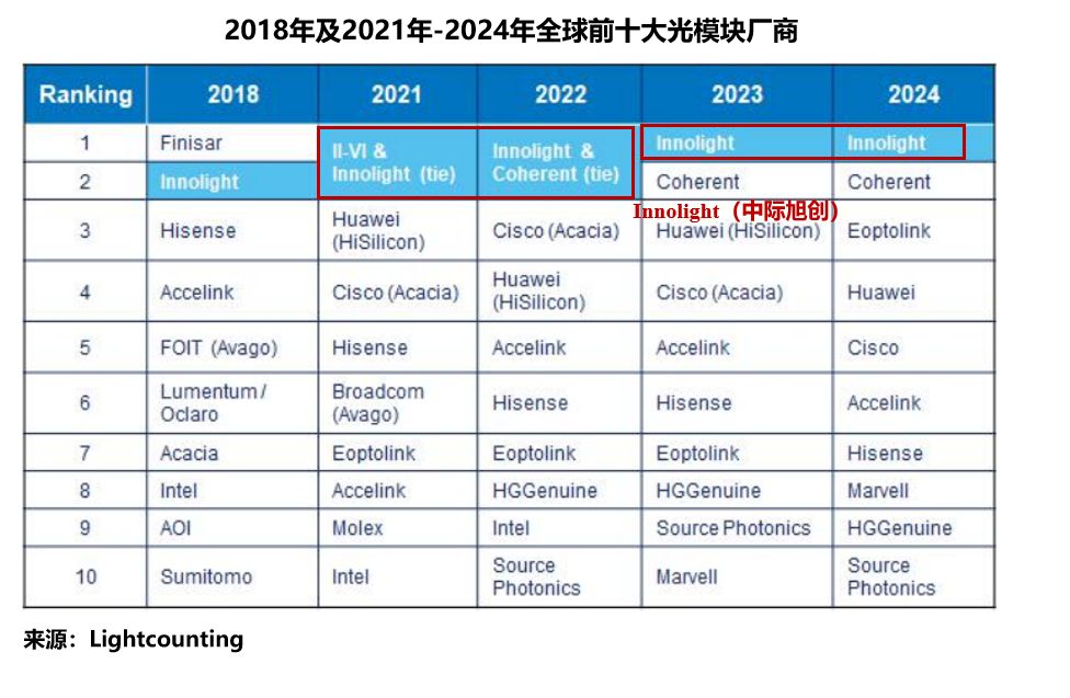 2021-2024年,在全球光模块厂商中,中际旭创已连续四年稳居第一。