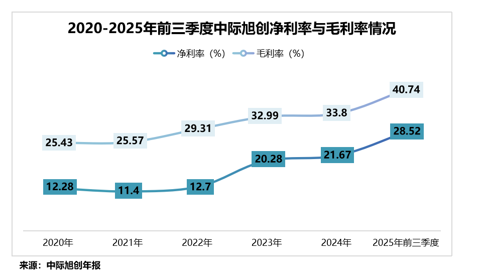 2020-2025年前三季度,公司毛利率从25.43%稳步增长至40.74%,净利率亦从12.28%翻倍提升至28.52%。