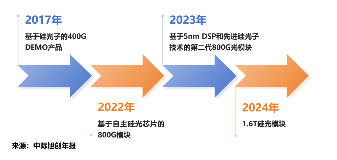 2022年,公司推出基于自主硅光芯片的800G模块;2023年,推出基于5nm DSP和先进硅光子技术的第二代800G光模块;2024年,再次推出1.6T硅光模块。