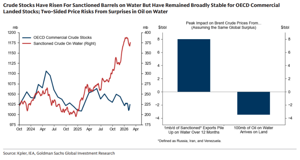 高盛在基准情景中假设,2026年海上原油库存占全球库存增量的比例将从2025年的47%回落至21%,但制裁松绑或地缘政治谈判进展均可能使这一比例大幅偏离预期,构成油价的双向风险。