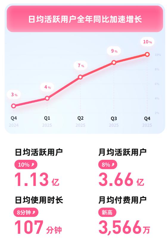其次是用户逆势增长。财报显示,2025年B站活跃用户数连续四个季度同比提速增长,日活跃用户1.13亿,同比增10%,月活用户3.66亿,同比增8%。