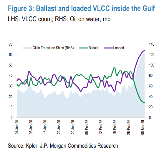 摩根大通警告:从本周起,产油国将被迫将原油转入陆上储罐,这将大幅加速储罐填满速度,进而推动整个区域更快进入强制停产阶段。