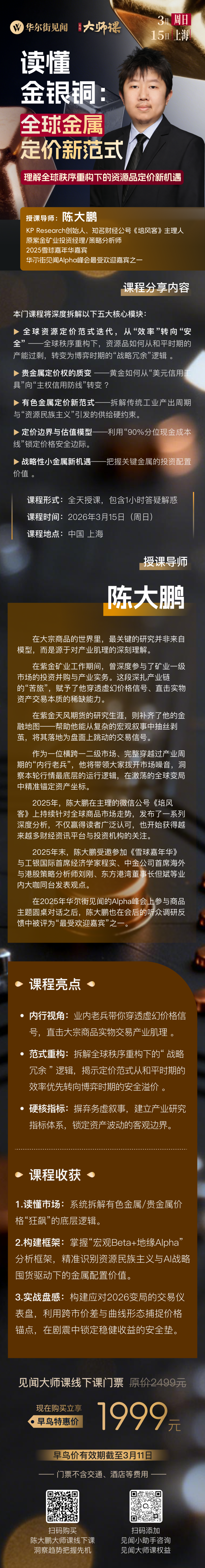 作为KP Research 的创始人,原紫金矿业的投资经理,陈大鹏曾在矿业一线参与过深度并购,也曾在券商担任策略分析师。这位完整穿越过产业周期的“内行老兵”近期正在与华尔街见闻筹备新一期的大师课《读懂金银铜:全球金属定价新范式》。