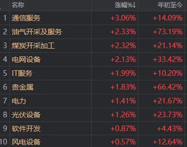 与此同时,通信服务板块低开高走,午后登顶涨幅榜;光伏、风电、软件等多个板块午后翻红。