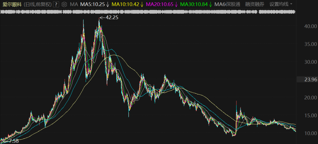 爱尔眼科目前在深圳证券交易所上市,市值约为960亿元人民币(约合138亿美元)。截至3月9日收盘,爱尔眼科股价接近五年来的最低点,过去12个月下跌了26%,较股价历史高点缩水超七成。