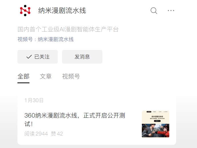 3月7日,导演杨涵涵介绍,该剧全程通过纳米漫剧流水线完成制作。纳米漫剧流水线官方公众号显示,其是国内首个工业级AI漫剧智能体生产平台,关联公司为深圳元创智寻科技有限公司。据企查查信息显示,该公司由北京奇元科技全资控股,隶属360数智科技体系,实控人为周鸿祎。