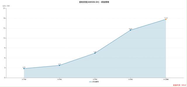据Wind统计,2021年—2025年前三季度末,公司的研发费用分别为2.79亿元、3.75亿元、7.46亿元、14.43亿元、17.72亿元。不足5年时间已经翻了6倍多。