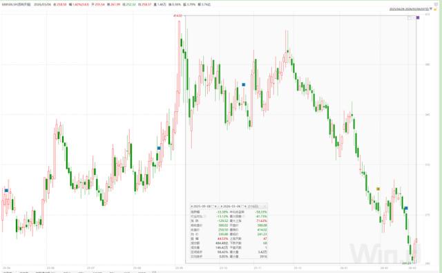 但二级市场对这次回购似乎“置之不理”,公司股价从2025年9月的历史高点414.02元/股,到如今徘徊在260元左右,市值蒸发近600亿元。