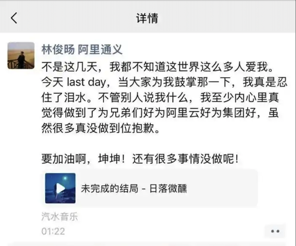 离别感慨、抒意歌曲以及“汽水音乐”这些要素,定格为了林俊旸作为阿里人的最后一刻。