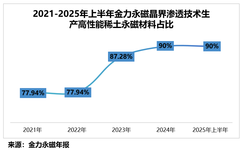 2025年上半年,金力永磁使用晶界渗透技术生产的高性能稀土永磁材料产品占总产品比例超90%。