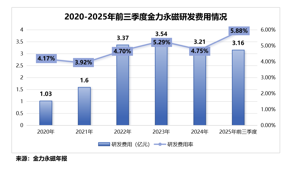 为攻克钕铁硼磁钢的技术门槛,金力永磁持续加大研发投入强度。2020-2025年前三季度,公司累计投入研发费用近16亿元,研发费用率也从4.17%逐步上升至5.88%。
