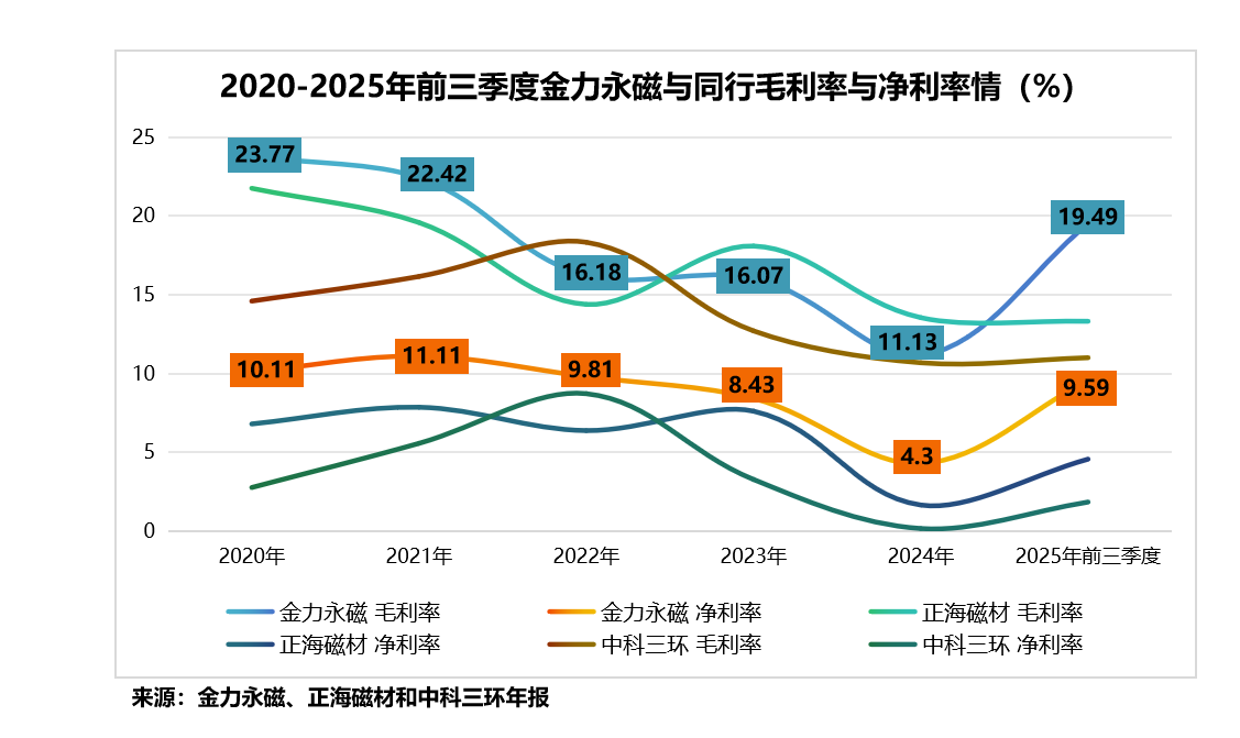 具体来看,在毛利率方面,三家公司均呈震荡下行趋势,但金力永磁在2025年前三季度强势反弹至19.49%,修复能力远超正海磁材和中科三环。