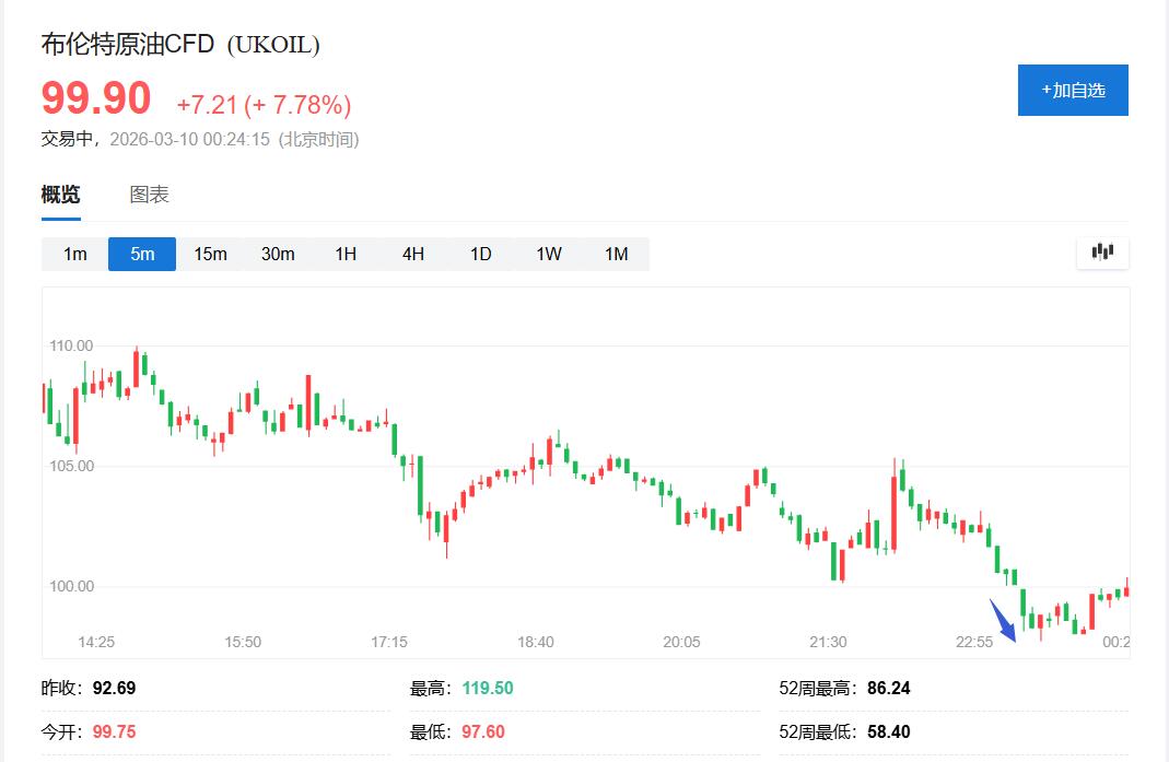 本周一美股早盘时段G7声明发出后,国际原油日内涨幅进一步收窄。布油和美国WTI原油均在美股早盘刷新日低,布油跌至97.6美元,日内涨约5.3%,亚市盘中也曾涨至119美元上方、日内涨逾31%的美油曾跌至94.70美元下方,日内涨约4.1%。