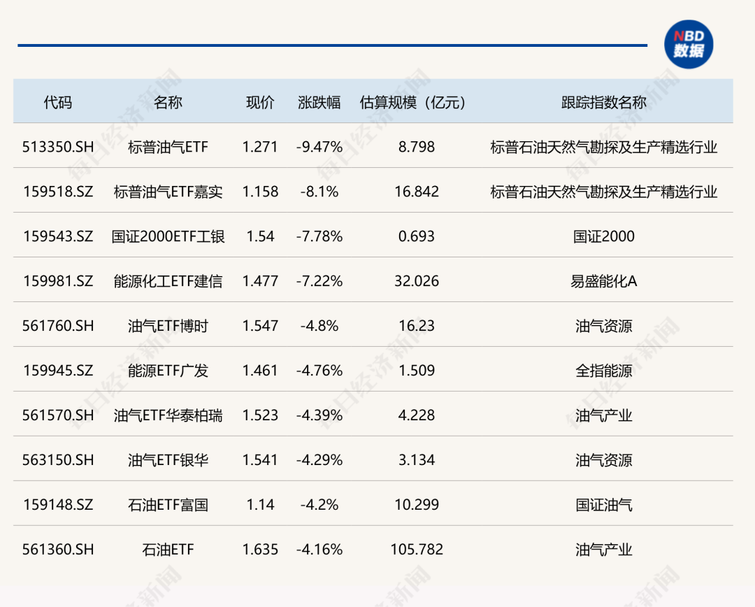 下跌方面,标普油气ETF跌超9%。