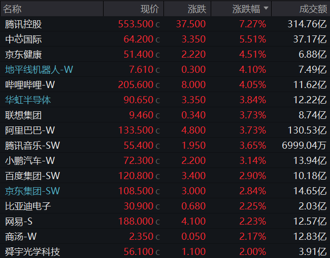 科网股集体大涨,腾讯控股涨超7%,中芯国际涨超5%,哔哩哔哩涨超4%,华虹半导体、联想集团、阿里巴巴涨超3%,百度集团、京东集团、网易等均走高。
